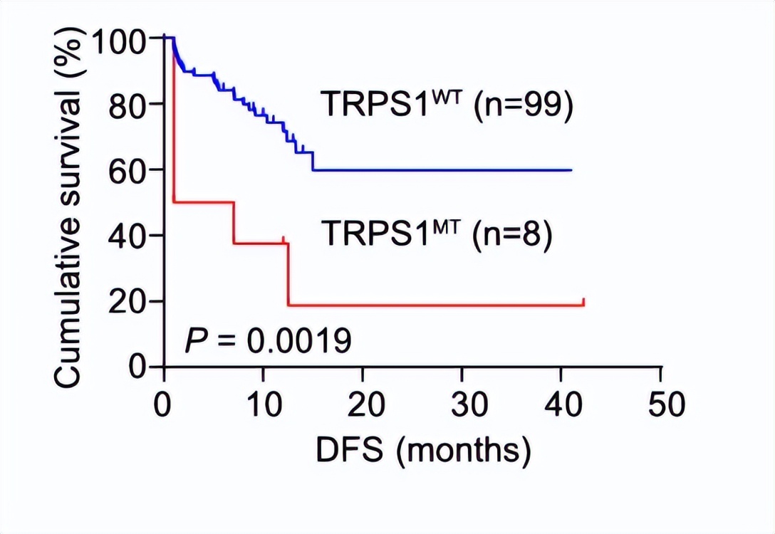 此研究的另一重要发现是TRPS1基因的R544Q突变在肝转移中起到了关键推动作用。在对肿瘤原发灶和转移灶的突变差异分析发现,肝转移灶中TRPS1基因的R544Q突变在肝转移细胞中显著富集,而淋巴转移灶和原发灶并没有。突变后的TRPS1通过与ZEB1启动子结合,并激活其转录表达,从而激活上皮-间质转化(EMT)过程,显著增强了癌细胞的侵袭和迁移能力。体外实验结果及动物实验结果均显示,携带TRPS1 R544Q突变可显著促进结直肠癌细胞转移。进一步对结直肠癌(CRC)患者TRPS1基因表达及其相关因素分析发现,TRPS1突变与病理分期显著相关,且TRPS1突变患者具有较差的无病生存期(DFS)和较差的总生存期(OS)。同时还发现TSR1的表达与KRAS、NRAS、HRAS、BRAF呈弱相关性,但与ZEB1、ZEB2有显著关联。