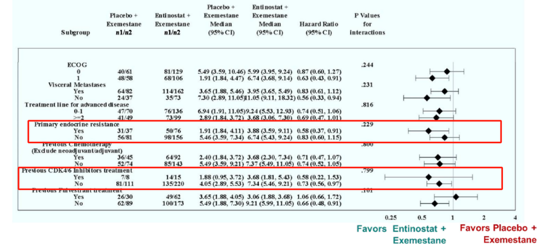 在针对PFS的亚组分析中可见,总体上各亚组均有获益趋势,其中原发性内分泌耐药、既往接受过CDK4/6i亚组患者的PFS获益幅度更大,HR值仅约为0.57,意味着原发ET或CDK4/6i耐药的患者接受恩替司他治疗后的进展或死亡风险可显著降低近一半,展现了恩替司他在逆转内分泌耐药方面的强大实力。