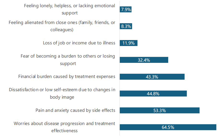 对患者治疗意愿的深入分析显示,导致患者考虑停止治疗的最显著因素是无法忍受的治疗相关不良反应(67.4%)(图2)。值得注意的是,91.7%的患者面临心理健康问题,主要原因包括对疾病进展和治疗无效的担忧(64.5%)、对治疗不良反应的焦虑(53.3%)以及对身体形象改变的不满(44.8%)(图3)。