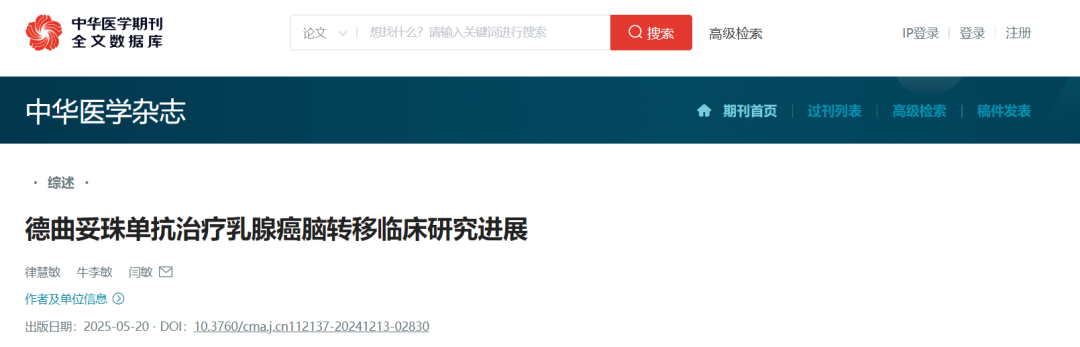 [1]律慧敏,牛李敏,闫敏.德曲妥珠单抗治疗乳腺癌脑转移临床研究进展.中华医学杂志2025年5月20日第105卷第19期