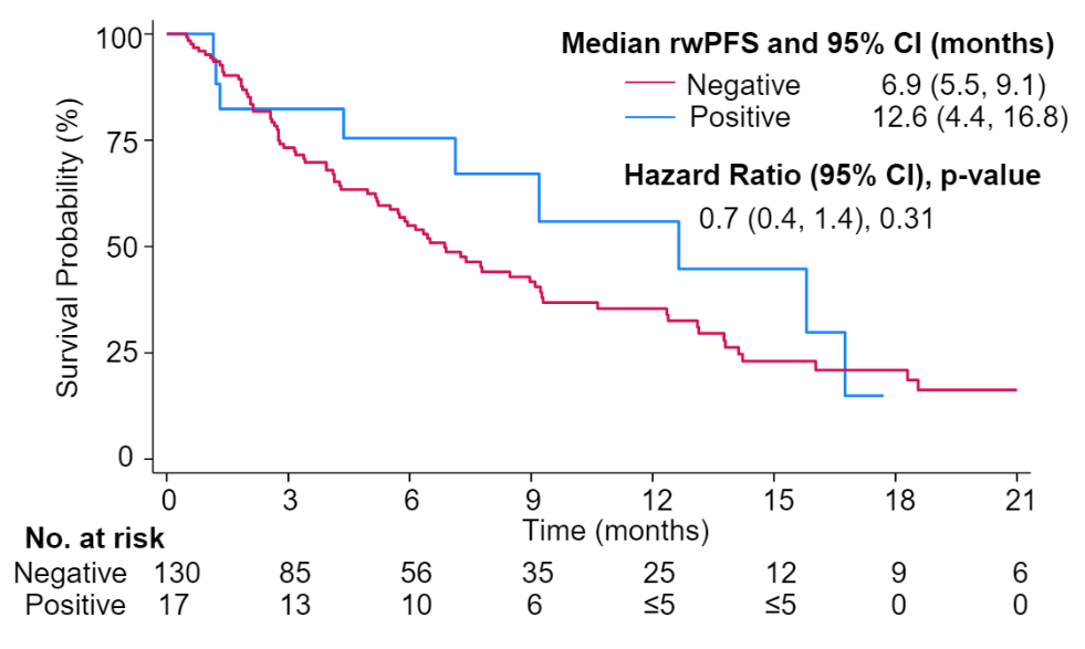 在149例有PD-L1状态信息的患者中,18例(12.0%)为PD-L1阳性(22C3方法评估:CPS≥10)。与PD-L1阴性患者相比,PD-L1阳性患者的rwPFS(12.6 vs 6.9个月,HR 0.7,P=0.31)和OS(NR vs 14.7个月,HR 0.5,P=0.18)在数值上更长,尽管没有显著统计学意义。