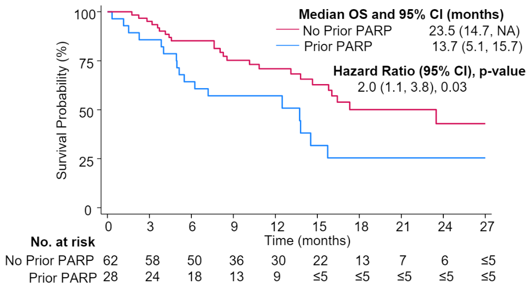 在接受T-DXd治疗的BRCA突变患者中,PARPi经治患者与未经治患者的rwPFS相似(7.2 vs 7.8个月,HR 1.1,P=0.71),但PARPi经治患者的OS显著更短(13.7 vs 23.5个月,HR 2.0,P=0.02)