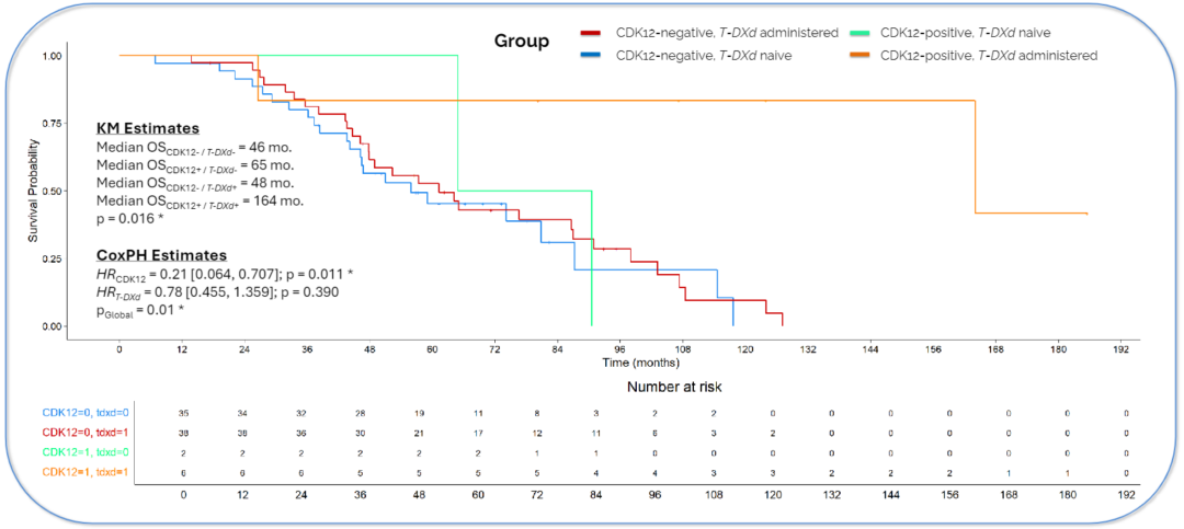 这项基于ctDNA的生物标志物分析显示,携带CDK12突变的HER2+mBC患者与更好的OS相关,尤其是接受T-DXd治疗的患者。这些结果表明CDK12突变可能在耐药和敏感性机制中发挥关键作用,从而影响T-DXd治疗效果,并为未来的新治疗策略提供见解。