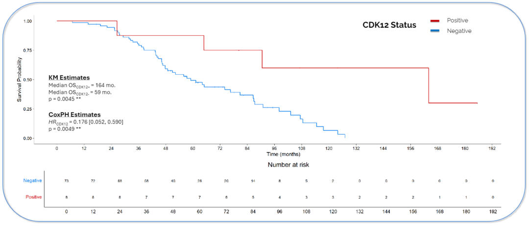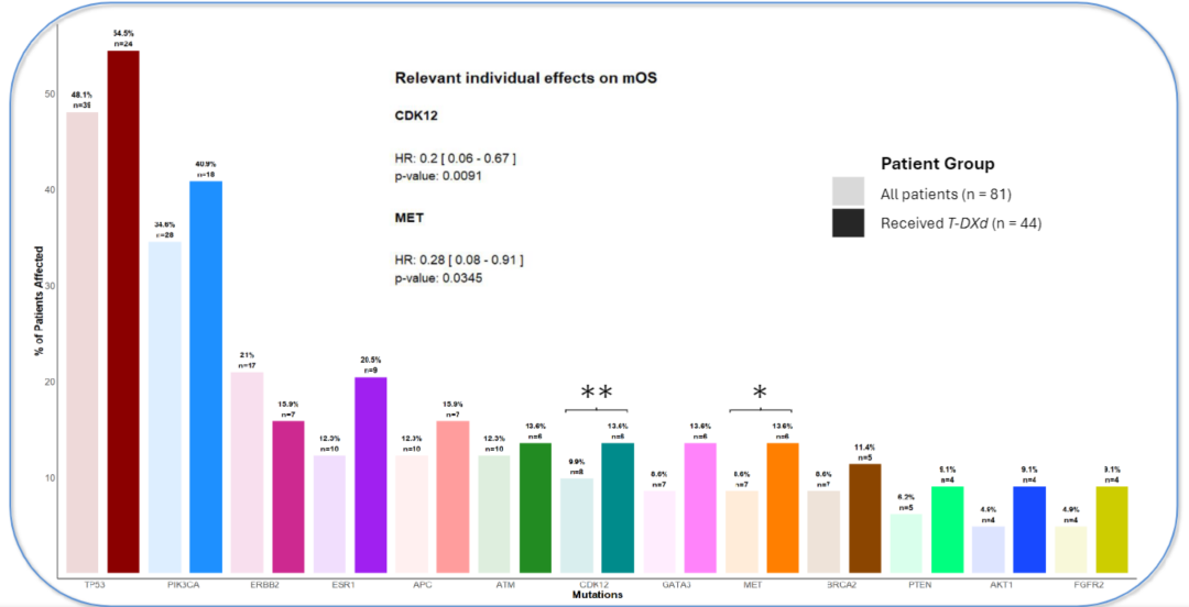 该队列患者的中位OS为7.22年,在中位随访4.65年期间,最常检测到的突变是:TP53(48%,39/81)、PI3KCA(35%,28/81)、ERBB2(21%,17/81)、EGFR(16%,13/81),ESR1、ATM、APC(各12%,10/81),以及CDK12(10%,8/81)。