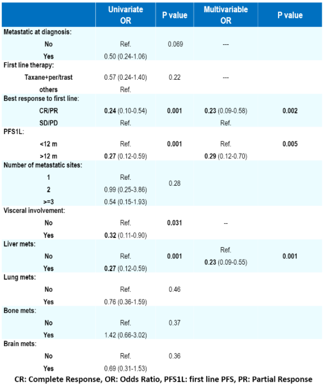 研究人员根据初诊是否为转移、一线治疗是否为曲帕双靶+紫杉、一线治疗PFS是否超过12个月、一线治疗最佳反应(CR/PR或SD/PD)、转移性疾病治疗线数、是否有内脏转移(包括肝、肺转移)、脑转移等进行单因素和多因素Logistic分析。其中,多因素分析显示:更好的一线治疗PFS(PFS 1L>12个月)、一线治疗反应(达到CR/PR)与T-DXd二线治疗的PFS 12+显著相关,可分别增加71%(OR 0.29,P=0.005)和77%(OR 0.23,P=0.002)达到PFS 12+的几率;此外,肝转移也可增加T-DXd二线治疗达到PFS 12+的几率(OR 0.23,P=0.001)。