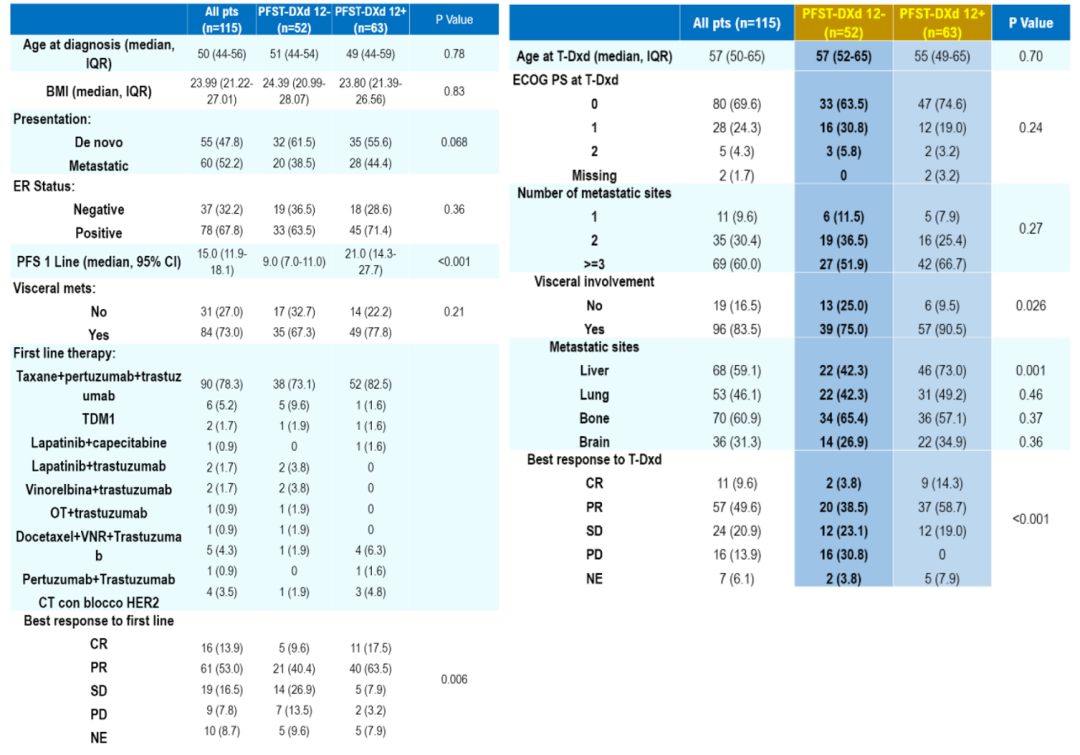 研究共收集129例患者,平均年龄为50岁,其中115例患者疗效可评估,T-DXd前的一线治疗和T-DXd二线治疗的患者特征如下图所示。在接受T-DXd二线治疗的患者中,PFS 12-队列有52例,中位PFS为8.6个月;PFS 12+队列有63例,中位PFS为17.9个月。