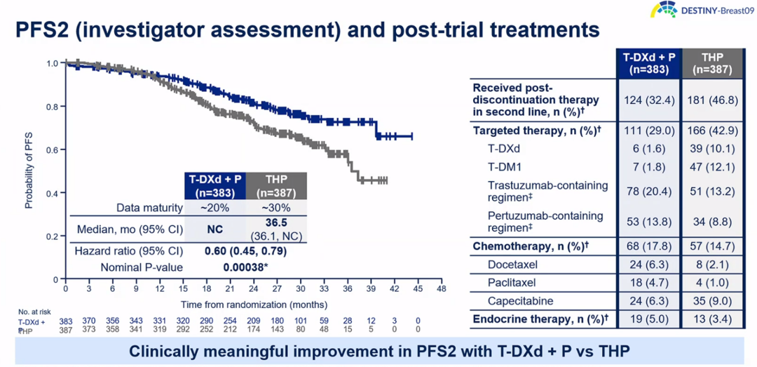 纵览乳腺癌抗HER2治疗发展史,从单靶治疗发展到双靶治疗,而双靶治疗已经有十几年的历史,并且成为非常经典且重要的治疗方式。而如今,这一“经典”可能面临改变,大家都十分关注T-DXd联合帕妥珠单抗(T-DXd+P)或者单独使用T-DXd,能否超越现有的标准一线治疗THP方案(紫杉+曲妥珠单抗+帕妥珠单抗)。根据目前的随访结果,DB-09研究达到了主要研究终点,盲态独立评审中心(BIRC)评估T-DXd+P的中位PFS显著长于THP(40.7 vs 26.9个月;HR 0.56,95%CI:0.44~0.71,P<0.00001)。