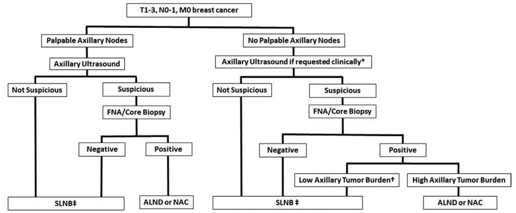 图2.T1-3N0-1M0期乳腺癌患者的腋窝分期诊断路径[3]