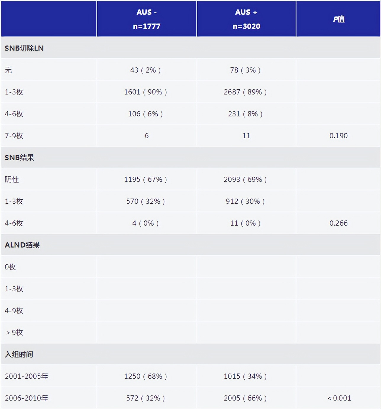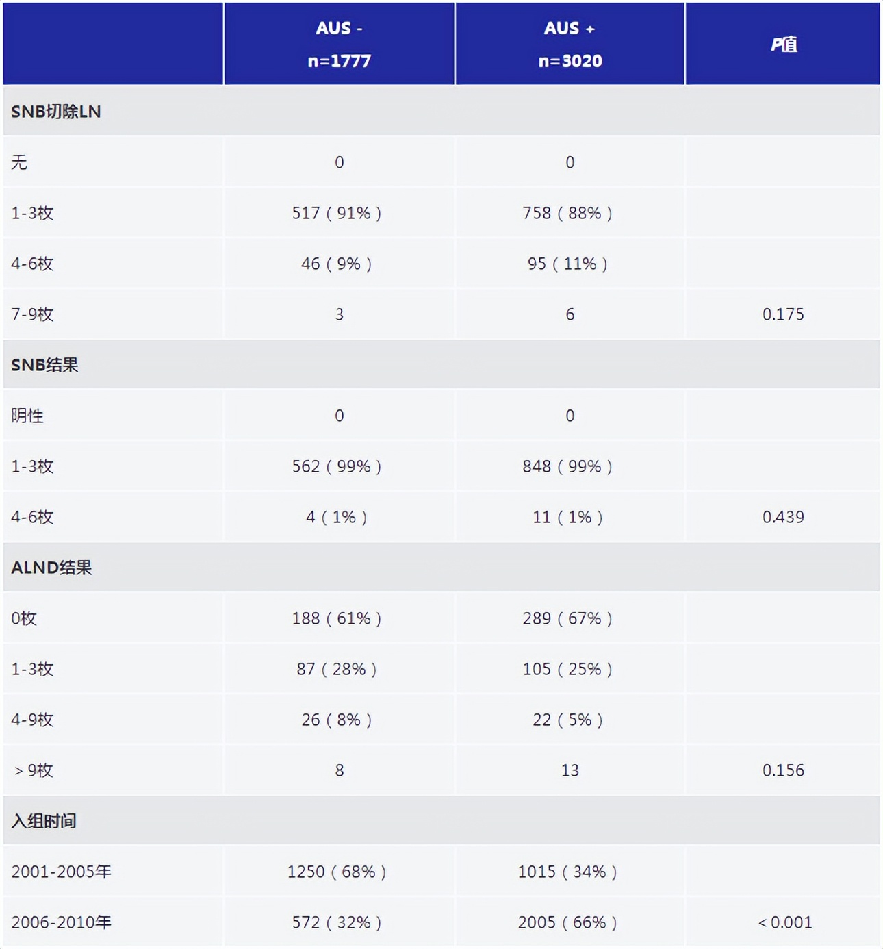 表1.所有AMAROS研究入组患者(n=1806)中AUS-和AUS+组的淋巴结状态
