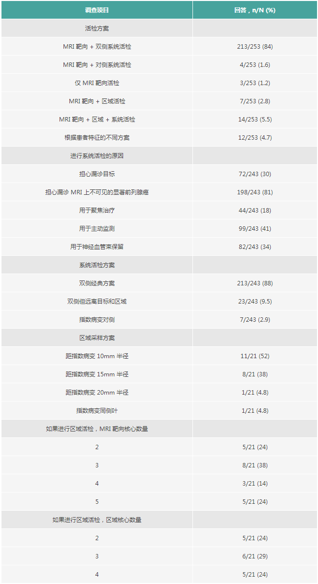 编者按:在全球前列腺癌诊疗领域技术革新的浪潮中,法国Alessandro Uleria教授团队近期开展了一项欧洲的横断面调查,分析了前列腺癌诊断技术迭代关键期所面临的核心临床矛盾。当MRI靶向穿刺活检技术渐趋成熟,如何在“靶向联合病灶周围穿刺”与“系统穿刺活检”之间精准锚定最佳平衡点,成为亟待破解的重要课题[1]。该研究借助28项精心设计的在线问卷,系统且全面地梳理了欧洲泌尿外科医师在活检方案抉择、操作细节把控以及决策逻辑构建等方面的现实状况,为深入剖析指南推荐与临床实践之间的落差,提供了极具价值的实证依据。