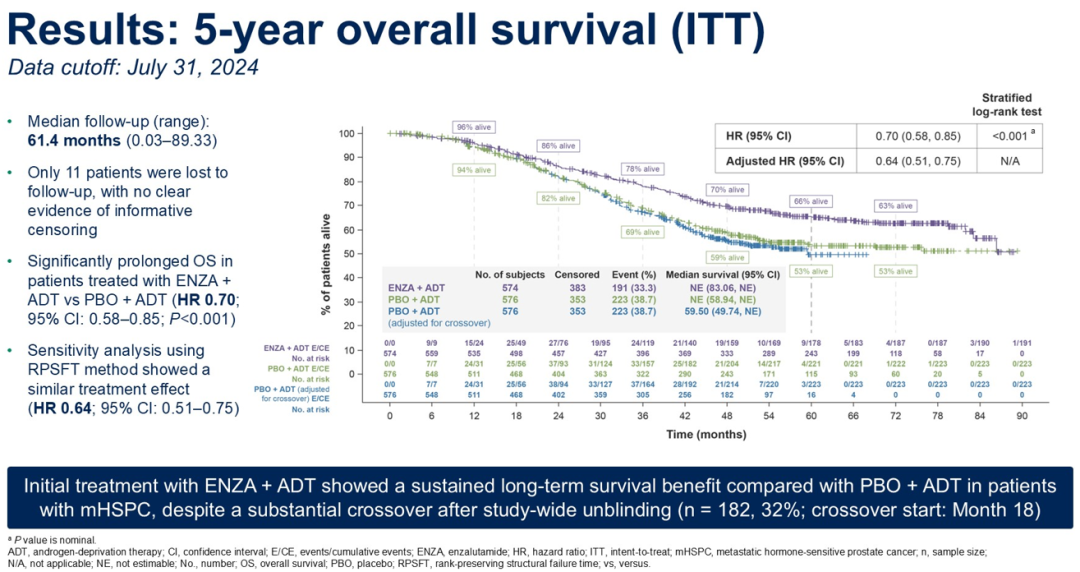 在2025年美国临床肿瘤学会(ASCO)年会上,该研究公布了5年OS随访数据[9]。值得关注的是,在中位随访61.4个月时,尽管ADT联合安慰剂组中有32%(182例)的患者在疾病进展前接受恩扎卢胺的有效治疗,但这一因素并未对整体研究数据产生实质性影响。研究结果显示,恩扎卢胺联合ADT仍较安慰剂联合ADT治疗显著降低患者死亡风险30%(HR 0.70;P=0.0003),恩扎卢胺联合ADT治疗组的患者五年生存率为66%,而安慰剂联合ADT组为53%,充分证明了恩扎卢胺联合ADT治疗方案的有效性。更为值得一提的是,在经过统计学校正交叉因素后,恩扎卢胺联合ADT组的OS获益更加显著,死亡风险降低36%(HR 0.64,95%CI:0.51-0.75)。这一结果进一步强调了恩扎卢胺治疗方案的可靠性和临床应用价值。