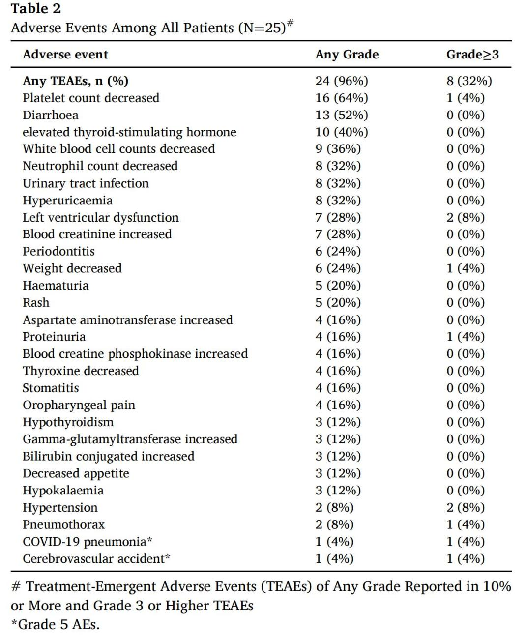 24例(96.0%)患者出现治疗期间不良事件(TEAE),其中8例(32%)发生3级TEAE。最常见TEAE包括血小板计数降低(64%,≥3级:4%)、腹泻(52%,均<3级)、促甲状腺激素(TSH)升高(40%,均<3级)、白细胞计数降低(36%,均<3级)。4例(16%)患者报告严重不良事件,无治疗相关不良事件(TRAE)导致死亡。因TRAE导致安罗替尼减量、中断和停药的比例分别为52%、32%和16%,奥希替尼无患者发生剂量调整。