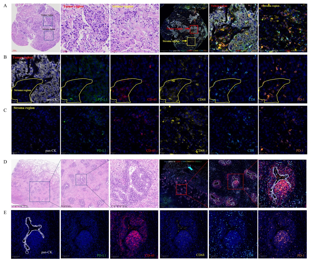 A-C,靶向治疗耐药后肿瘤组织的HE与mIF染色;D-E,手术切除样本的HE与mIF染色。mIF标记物包括DAPI(蓝色)、pan-CK(白色)、PD-L1(绿色)、CD45(红色)、CD68(黄色)、CD8(亮蓝色)及PD-1(橙色)。
