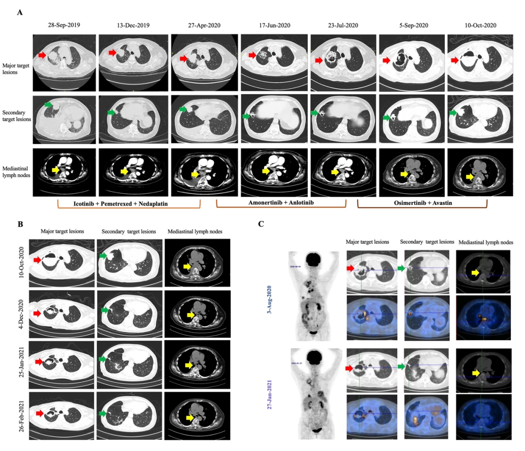 红色箭头表示主要靶病灶,蓝色箭头表示次要靶病灶,黄色箭头表示转移淋巴结。A,EGFR-TKI治疗期间肿瘤影像学改变;B,免疫联合化疗期间肿瘤影像学改变;C,PET-CT评估免疫联合化疗前后肿瘤代谢水平。