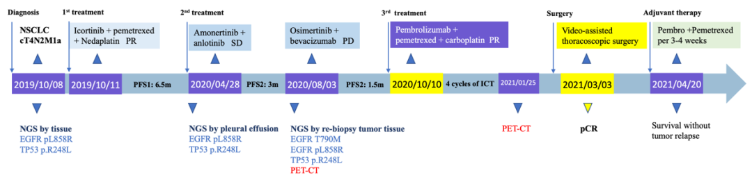既往接受多线靶向治疗(一线:埃克替尼联合培美曲塞+奈达铂,PFS1:6.5个月,最佳疗效PR;二线:阿美替尼+安罗替尼序贯奥希替尼+贝伐珠单抗,PFS2:4.5个月,最佳疗效SD;),均出现疾病进展。(图1、图2)