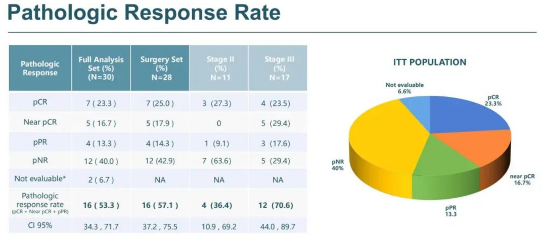 2024年公布的III期临床研究数据,纳武利尤单抗(NIVO)联合伊匹木单抗(IPI)在III期黑色素瘤新辅助治疗中降低了26.5%的1年复发风险,pCR(病理完全缓解)率达到了47.2%,MPR的患者1年RFS(无复发生存)率达到了95.1%[2]。今年ASCO大会上,同样是NIVO+IPI新辅助的II期C-IT Neo trial研究报道了相似的结果,pCR率达45.4%,MPR患者1年RFS率为100%,但此研究仅纳入了22例患者。