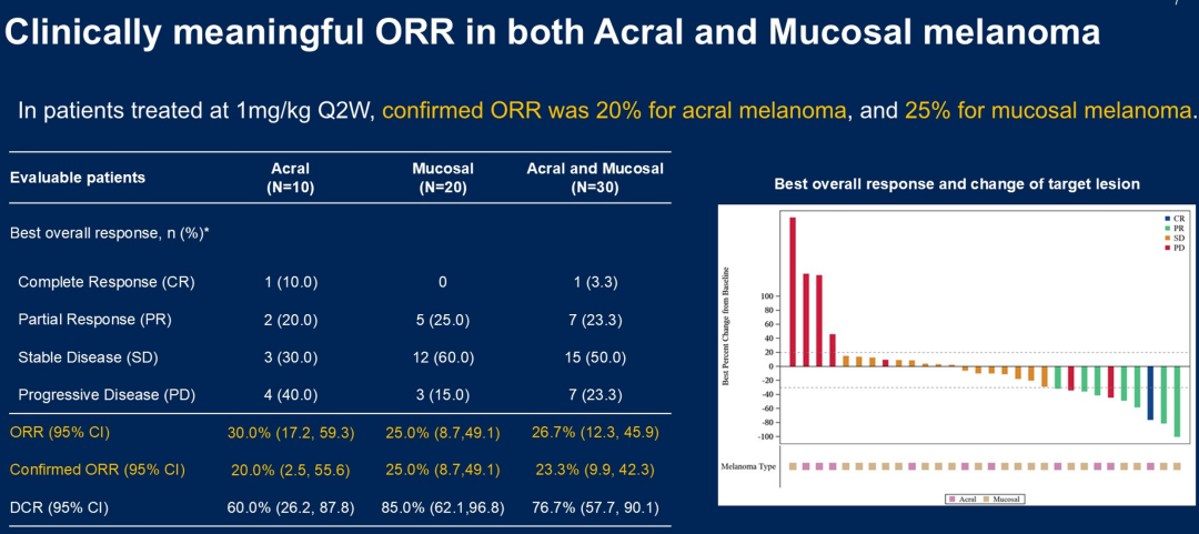 我国肢端及黏膜黑色素瘤对免疫治疗反应欠佳,免疫单药在晚期肢端及黏膜中ORR(客观缓解率)仅在15%左右,PFS(无进展生存)不足3个月[3,4],亟待开发更有效的新型免疫治疗策略。今年ASCO大会公布了一项PD-1/IL-2a偏向激动剂双抗IBI363在免疫经治的肢端和黏膜黑色素瘤中开展的1/2期研究,结果显示,总体ORR达26.7%(肢端型20%,黏膜型25%),DCR 76.7%,中位PFS 5.7个月、OS 14.7个月(黏膜亚型达19.3个月)。安全性方面,3级以上TRAE发生率29%,仅3.3%因毒性停药。