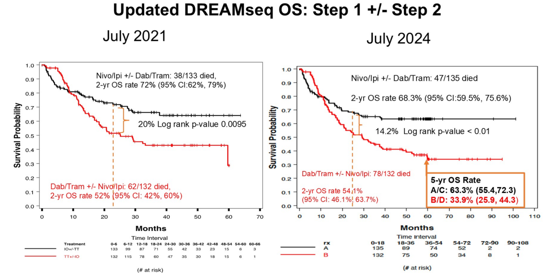 随着COMBI-D、COLUMBUS、CheckMate 067等研究结果的公布,双靶(BRAF+MEK)和双免(PD-1+CTLA-4)治疗跻身于BRAF突变晚期黑色素瘤的一线治疗方案,但靶向和免疫先后应用顺序的选择尚需更多的临床研究证据[1,5,6]。这次公布的DREAMseq试验5年随访结果,对于初治BRAF V600突变转移性黑色素瘤患者,纳武利尤单抗联合伊匹木单抗(N/I)序贯达拉非尼/曲美替尼(D/T)的治疗策略显著优于反向序贯方案。中位随访58个月数据显示,双免疫优先组的5年OS率较双靶向优先组绝对提升近30%,5年PFS率提高近3倍,且中枢神经系统无进展时间显著延长(12.2个月vs 8.4个月,P<0.01)。