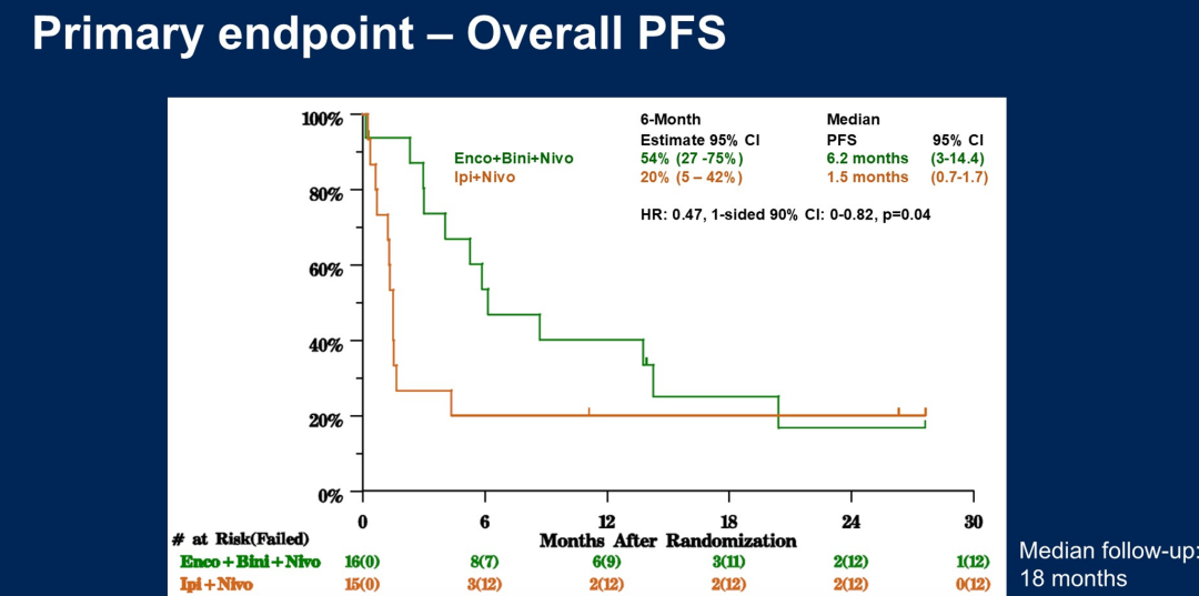 Checkmate 204研究提示黑色素瘤脑转移患者NIVO+IPI联合方案可明显获益,但在有症状转移患者中效果欠佳,这可能与有症状脑转移患者应用糖皮质激素有关[7]。而对于BRAF突变的脑转移患者,无论有无症状,双靶治疗在颅内和颅外都能达到相似的ORR(60.8%vs 59.1%)[8,9]。因而,双靶联合免疫有可能可以进一步提升BRAF突变脑转移患者的有效率。II期随机试验SWOG S2000对比了双靶联合免疫(BRAF抑制剂Encorafenib+MEK抑制剂Binimetinib+nivolumab)与NIVO+IPI在BRAF突变脑转移患者中的疗效。结果显示,双靶联合免疫组在PFS(6.2个月vs 1.5个月)和颅内ORR(75%vs 13%)方面显著优于双免疫组,但两组中位OS无显著差异(8.7个月vs 13.8个月,P=0.66)。