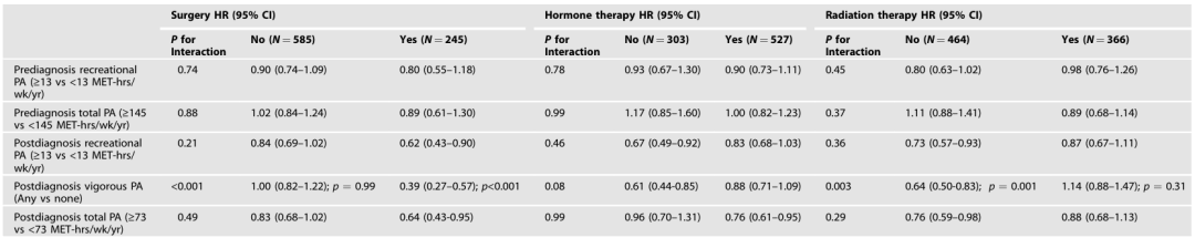 诊断前总体力活动与内分泌治疗存在统计学上边缘显著的相互作用(P=0.049),未发现其他显著关联。