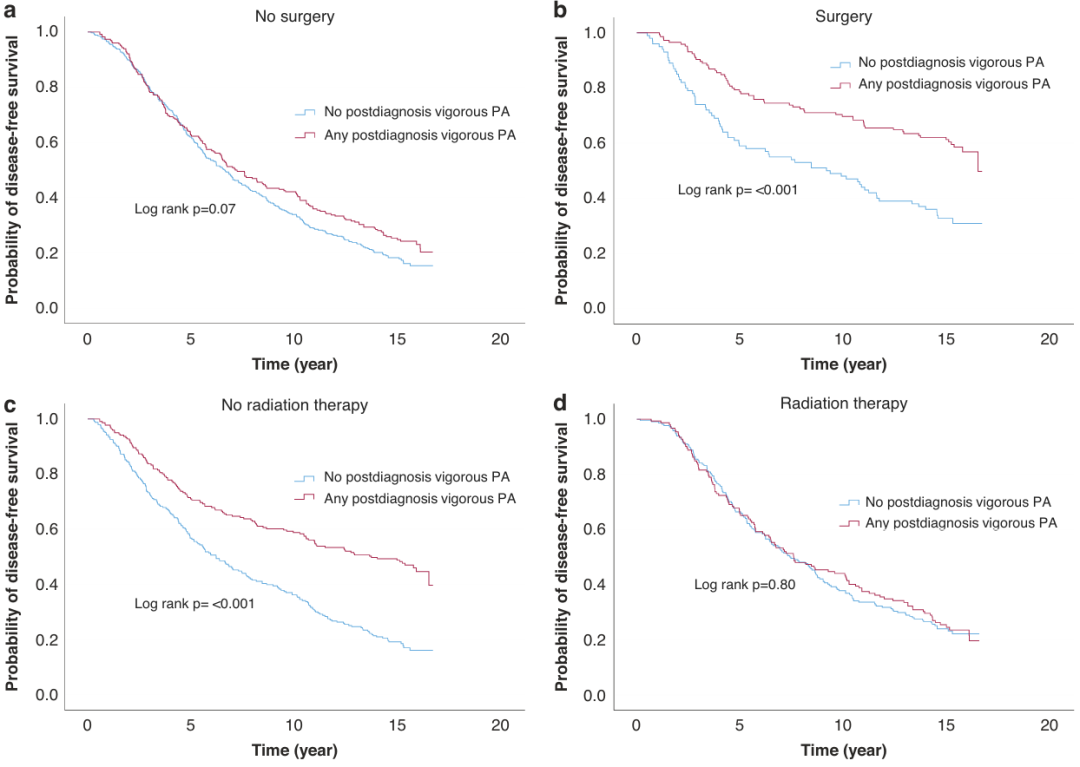 △前列腺癌患者确诊后进行剧烈体力活动与无病生存期之间的相关性(a:无手术;b:手术;c:无放射治疗;d:放射治疗)