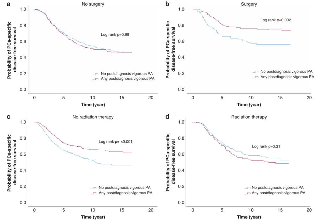 综上所述,确诊后进行体力活动,尤其是剧烈体力活动,与接受手术而非放射治疗的前列腺癌患者的预后改善相关。该结论需要进一步的临床研究和观察性研究来证实这一发现,并分析可能的机制和解释。