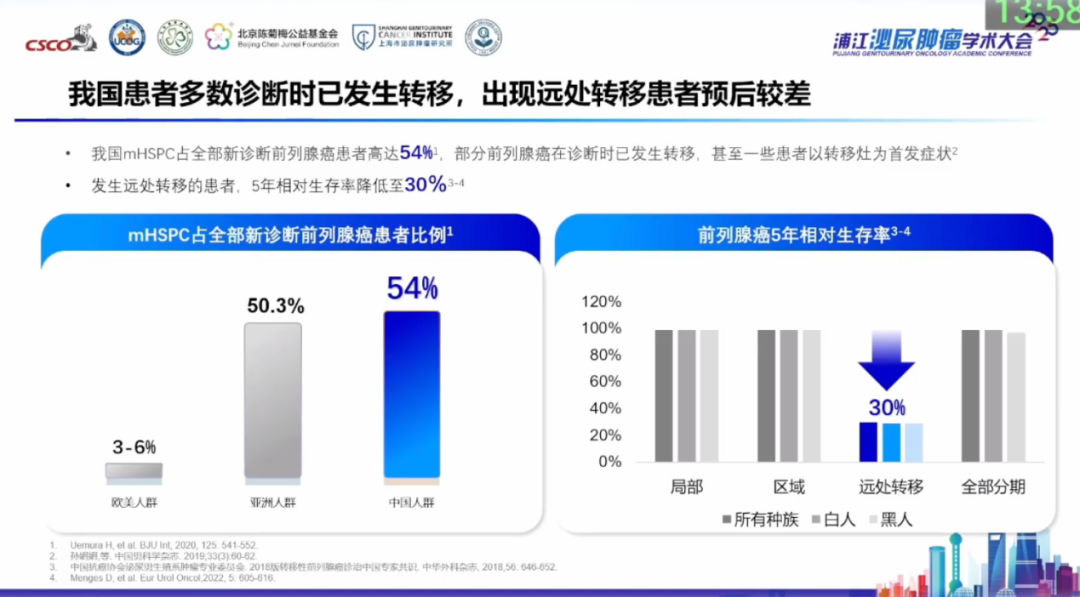 当前,中国前列腺癌患者多数被诊断时已发生转移,其中mHSPC患者占初诊患者的54%,部分患者甚至以转移灶为首发症状,然而随着公众健康意识的提升和早期筛查的推广,现状正逐步改善:盛锡楠教授援引数据显示,与10年前相比,国内大型医疗中心的前列腺癌根治手术量已从百余例大幅提升至千余例以上,期望初诊晚期患者占比将降至30%左右,进而使前列腺癌5年生存率整体提高。但目前转移性前列腺癌患者5年生存率仍相对最低,属“不可治愈”疾病,治疗目标仍是延长生存和改善生活质量,mHSPC治疗还需增加延缓疾病进展至激素难治性阶段(即mCRPC)的目标,因此优化治疗策略尤为重要。