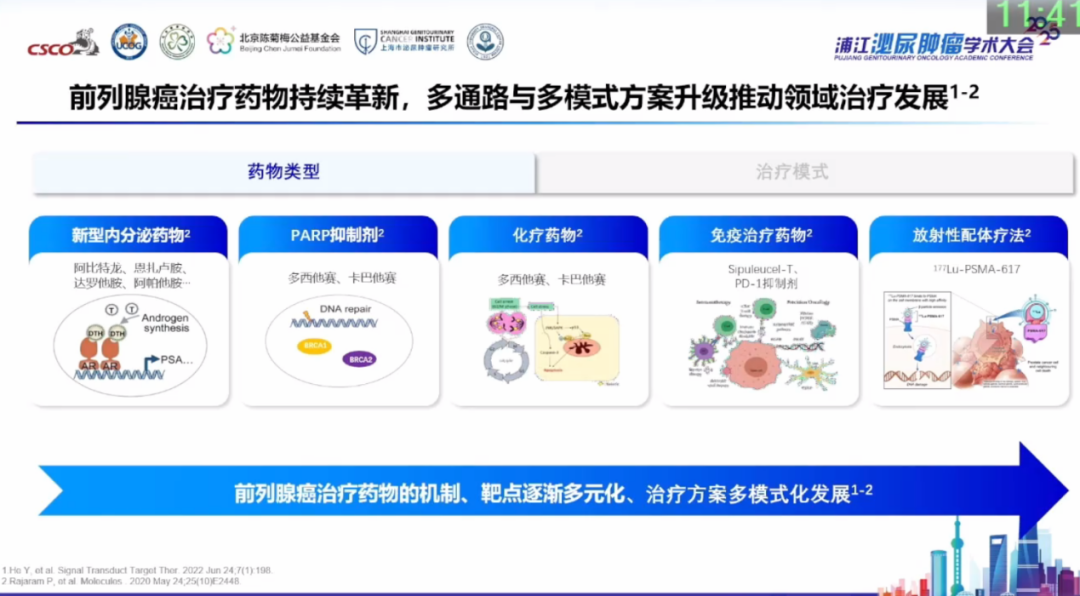 盛锡楠教授强调,前列腺癌的治疗策略正步入“新时代”,药物治疗的快速发展使转移性前列腺癌的分类从“激素依赖型和激素不依赖型”演变为更精准的“激素敏感和去势抵抗性前列腺癌(CRPC)”概念,既往激素敏感阶段的治疗手段相对单一,但目前多种药物治疗使用均已前移,极大地丰富了mHSPC的治疗选择,且治疗药物的更新迭代目前日新月异,传统内分泌治疗、化疗、靶向治疗、免疫治疗,乃至核素治疗均已广泛应用于前列腺癌领域。盛锡楠教授透露,目前还有团队积极探索前列腺癌的CAR-T细胞治疗,未来治疗模式将更加多元化。