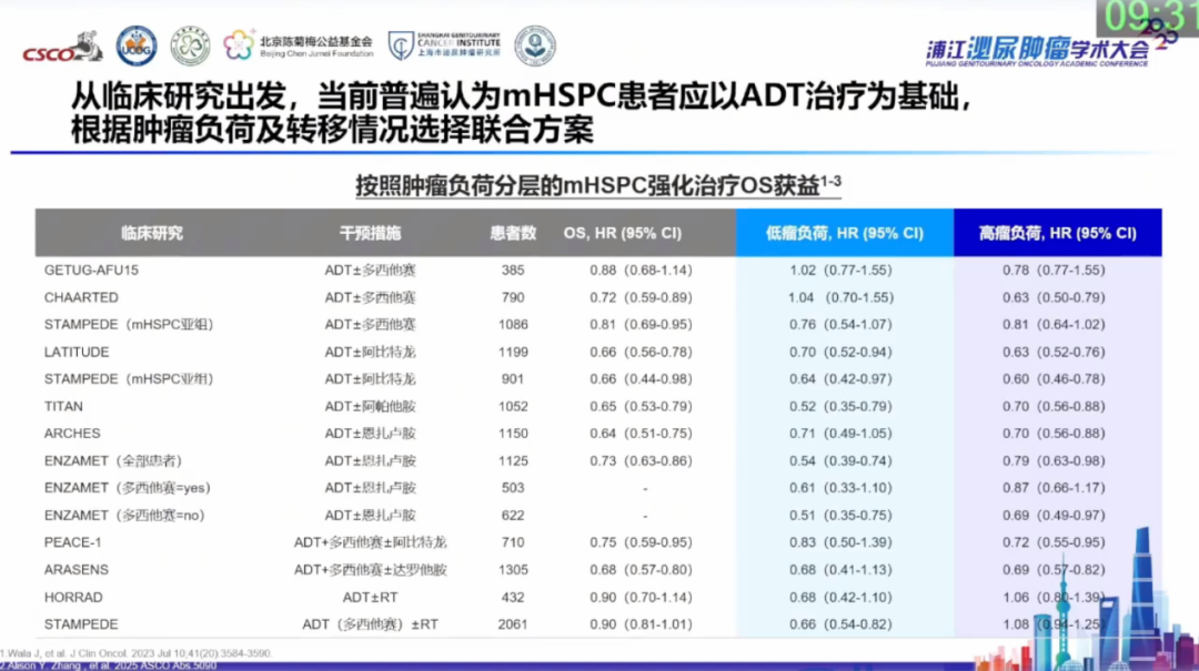 然而盛锡楠教授指出,并非所有患者都适合强化联合治疗,“同病不同命”的现象在前列腺癌患者中尤为突出,有些患者可依靠单一内分泌治疗安然度过数年,特别是部分高龄患者,但另一些患者则在短时间内疾病快速进展,因此根据疾病特征进行精准分层治疗至关重要。临床上常将患者区分为“低瘤负荷”和“高瘤负荷”、“低危”和“高危”等,无论采用何种分类方式,对于生物学行为相对惰性、肿瘤负荷较低的患者,治疗可“点到为止”;而对于肿瘤负荷较高的患者,联合治疗方案则能带来更大获益。目前,ADT联合新型内分泌治疗已成为肿瘤负荷较低mHSPC的优选策略,而三联方案更倾向用于肿瘤负荷较高的患者。