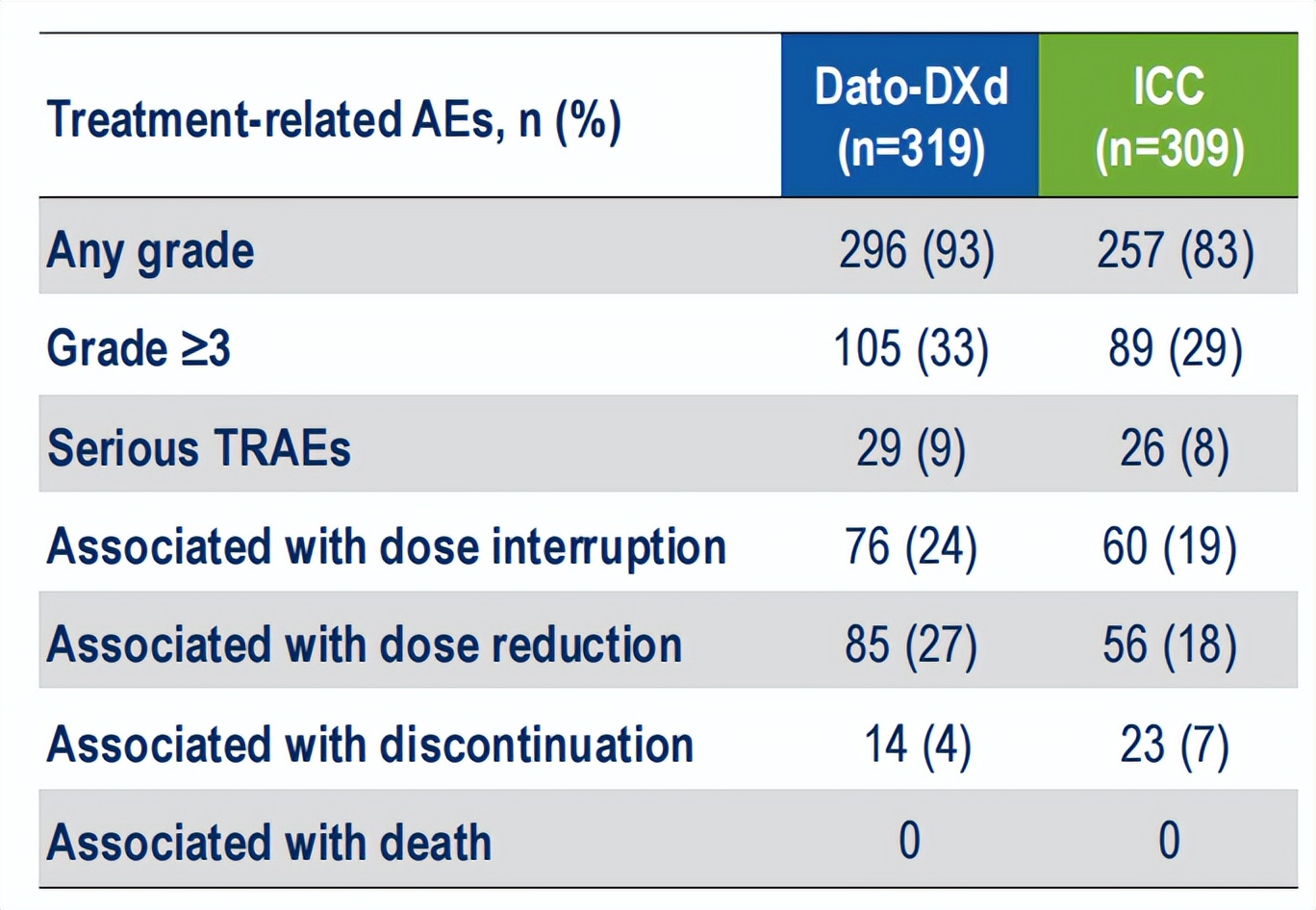 王晓稼教授:Dato-DXd组患者中位持续治疗时间为8.5个月(范围:0.7-38.0),ICC组患者中位持续治疗时间为4.1个月(范围:0.1-32.0),尽管Dato-DXd组的中位治疗持续时间是ICC组的两倍以上,但两组≥3级和严重治疗相关不良事件(AE)的发生率相似(33%vs29%),并且Dato-DXd组的停药率较低(4%vs7%)。
