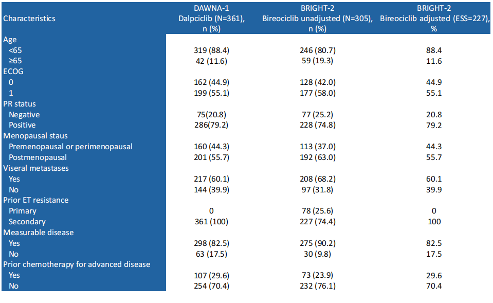 本次匹配调整间接比较(MAIC)使用了来自BRIGHT-2试验的个体患者水平数据(吡洛西利联合氟维司群组n=204 vs安慰剂联合氟维司群组n=101)以及来自DAWNA-1试验的汇总数据(达尔西利联合氟维司群组n=241 vs安慰剂联合氟维司群组n=120)。对BRIGHT-2试验中的患者进行加权,以匹配DAWNA-1试验中的关键基线特征,包括年龄、ECOG体能状态、既往内分泌治疗耐药情况(原发性vs继发性)、内脏转移、晚期阶段既往化疗史以及绝经状态。