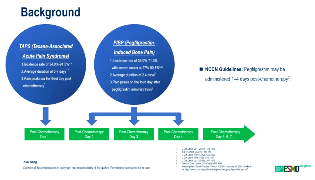 编者按:2025年ESMO年会上,广东省人民医院王坤教授代表团队做出了大会口头报告,公布了一项关于硫培非格司亭(Pegfilgrastim)给药时机与骨痛关系的前瞻性III期研究数据。该研究聚焦于紫杉类化疗后预防性应用长效升白针引发的骨痛管理难题,创新性地探索了不同给药时机对患者疼痛程度的影响。研究结果显示,化疗后72小时给予硫培非格司亭可显著降低患者骨痛的发生率与严重程度,且不影响其保护中性粒细胞的疗效。为此,肿瘤瞭望特邀王坤教授深入解读该研究源于中国临床实践的初衷、其对提升患者生活质量的现实意义,以及中国方案为全球肿瘤支持治疗带来的重要启示。