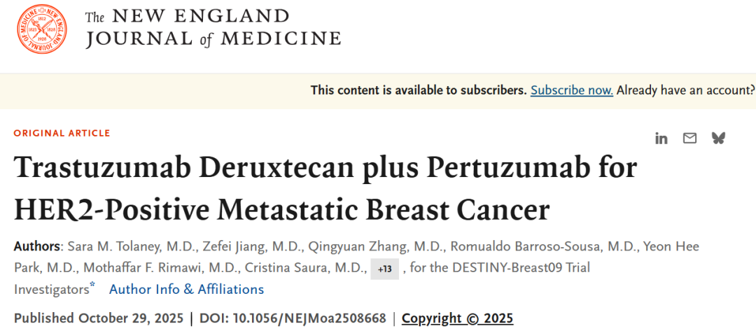 [1]Tolaney SM,Jiang Z,Zhang Q,et al.Trastuzumab Deruxtecan plus Pertuzumab for HER2-Positive Metastatic Breast Cancer.N Engl J Med.Published online October 29,2025.doi:10.1056/NEJMoa2508668