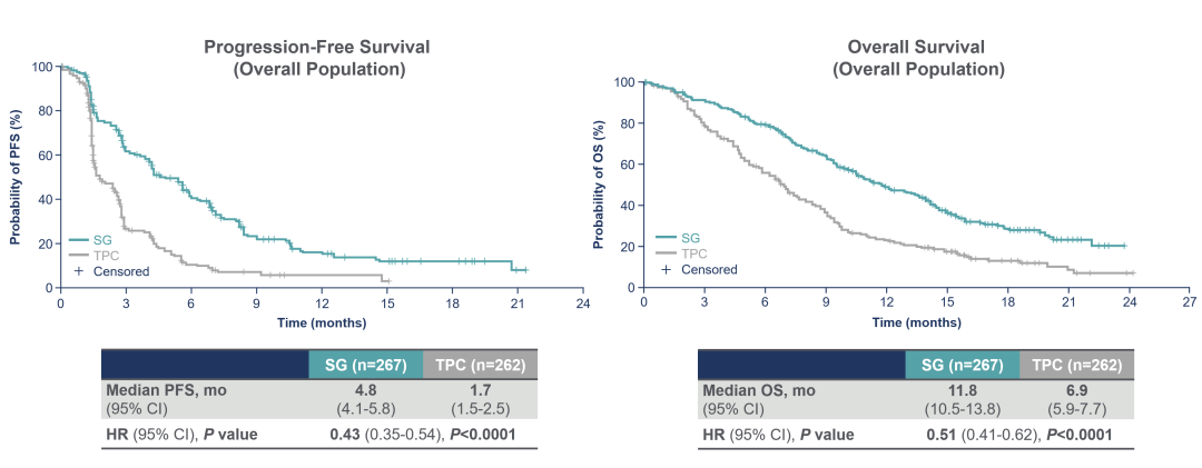 在二线治疗方面,ASCENT研究是首个成功验证Trop-2作为mTNBC治疗靶点的全球多中心Ⅲ期临床试验,该研究不仅确立了SG在晚期TNBC中的重要地位,也为Trop-2靶向ADC的临床应用奠定了基础。与医生选择的治疗方案(TPC)相比,SG显著改善了中位无进展生存期(mPFS:4.8个月vs 1.7个月,HR=0.43,95%CI:0.35–0.54,P<0.0001)和中位总生存期(mOS:11.8个月vs 6.9个月,HR=0.51,95%CI:0.41–0.62,P<0.0001)。值得关注的是,不同Trop-2表达水平的亚组均从SG治疗中获益,进一步巩固了其在TNBC二线治疗中的标准地位[6,7]