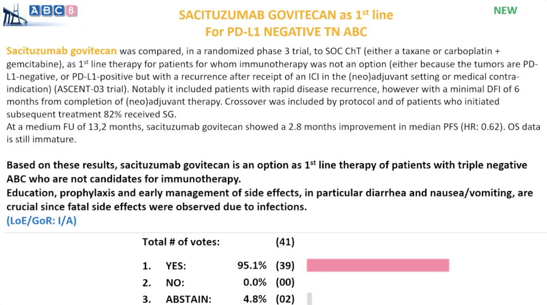 △ABC8国际指南专家投票结果:基于ASCENT-03研究结果,对于不适合免疫治疗的晚期TNBC患者,SG可以作为一线治疗选择(证据水平/推荐级别:I/A)