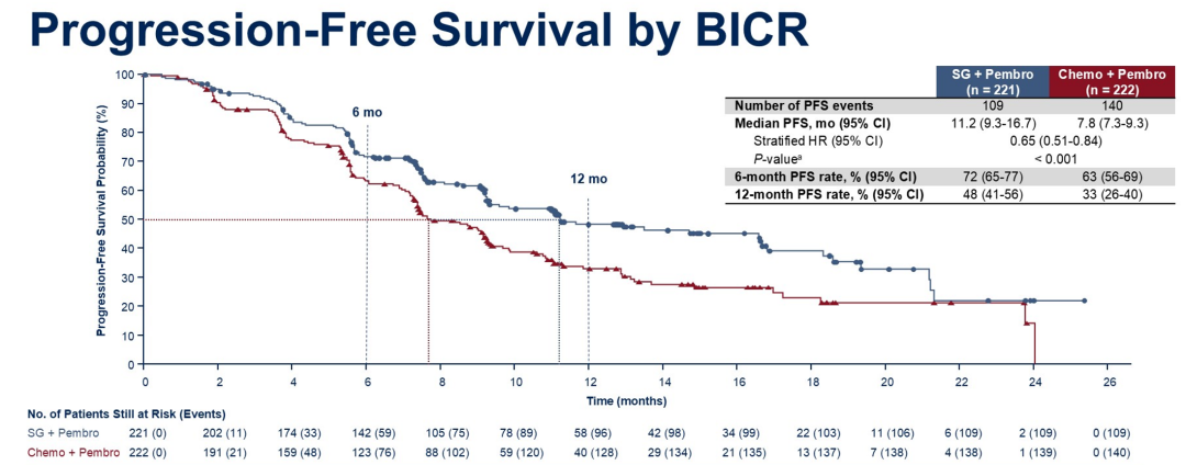 此次中期分析结果显示达到了主要研究终点,BICR评估SG组的中位PFS长达11.2个月,相较于化疗组(7.8个月)延长3.4个月,疾病进展或死亡风险显著降低35%(HR 0.65,95%CI:0.51-0.84,P<0.001),且在大多数预设亚组中均观察到一致的PFS获益趋势。OS数据尚未成熟,在化疗组有81%的患者后续使用SG治疗的情况下,SG组仍显示一定的OS获益趋势(NR vs NR,HR 0.89)。在肿瘤缓解方面,SG组的客观缓解率(ORR)在数值上高于化疗组(60%vs 53%),其中完全缓解(CR)率接近翻倍提升(13%vs 8%),中位治疗持续缓解时间(DoR)延长近1倍(16.5 vs 9.2个月),显示了深度、持久的肿瘤缓解。