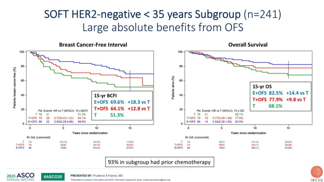 2025ASCO大会上汇报的SOFT&TEXT研究中位随访15年结果,确认了“AI+OFS”方案为绝经前HR+早期乳腺癌患者带来的持久获益。依西美坦+OFS相较于TAM+OFS持续改善疗效,15年DFS率分别为74.9%vs 71.3%(HR=0.82)[11]。研究进一步明确了可从AI+OFS方案中更高获益的患者特征,主要包括: