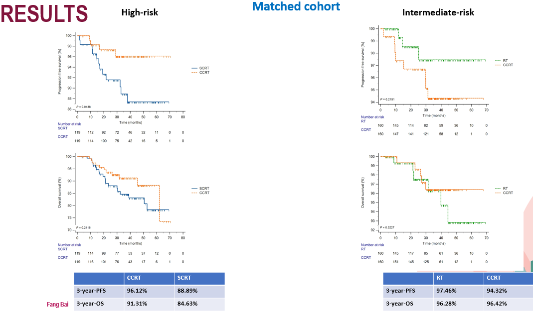 共确定了1436例患者,中位随访时间为32个月。在高危患者中,同步放化疗的3年无进展生存(PFS)率优于序贯放化疗/单纯放疗,但总生存期无显著差异。对于中危患者,单纯放疗/同步放化疗的3年PFS优于序贯放化疗,总生存期相当。