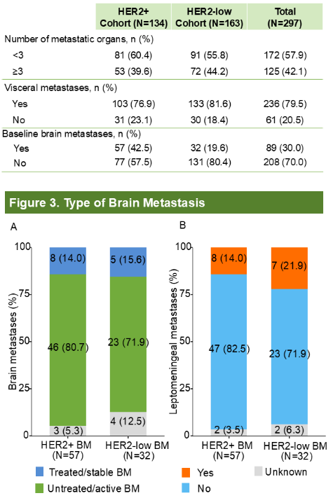 黄香教授:此次期中分析共纳入307例患者,其中297例纳入全分析集,包括134例HER2阳性队列患者与163例HER2低表达队列患者。基线特征数据显示,T-DXd在真实世界中治疗的患者非常复杂,涵盖不同体能状态、高/低肿瘤负荷、有/无内脏转移、有/无脑转移等复杂的人群,且覆盖大量难治性患者,例如79.5%入组患者存在内脏转移,其中42.1%患者存在≥3个器官转移;HER2阳性和HER2低表达队列分别有42.5%和19.6%患者存在脑转移。其中初治及活动性脑转移占比为70-80%,还有15-20%患者为软脑膜转移(HER2阳性队列14%、HER2低表达队列21.9%),此类患者既往亟需有效治疗,T-DXd获批上市后即提供了更好的治疗选择,也使我们在REFRESH研究中纳入了更多脑转移患者。