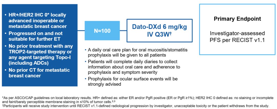 SABCS大会也公布了Dato-DXd前移治疗的临床试验TROPION-Breast06(TB06)研究设计[14]。值得注意的是,该研究入组人群更为精准,为内分泌治疗后进展、未接受化疗的HR+/HER2 IHC 0(定义为无染色,或≤10%的肿瘤细胞呈现不完整且微弱/难以察觉的膜染色)晚期乳腺癌患者,接受Dato-DXd单药治疗;主要终点是研究者评估的PFS,关键次要终点包括口腔黏膜炎/口腔炎、眼部不良事件和≥3级TRAE发生率。其他次要终点包括临床获益率、客观缓解率、缓解持续时间、OS等。此外,该研究将采集肿瘤组织和血液样本进行探索性分析,有望为筛选优势人群提供参考。