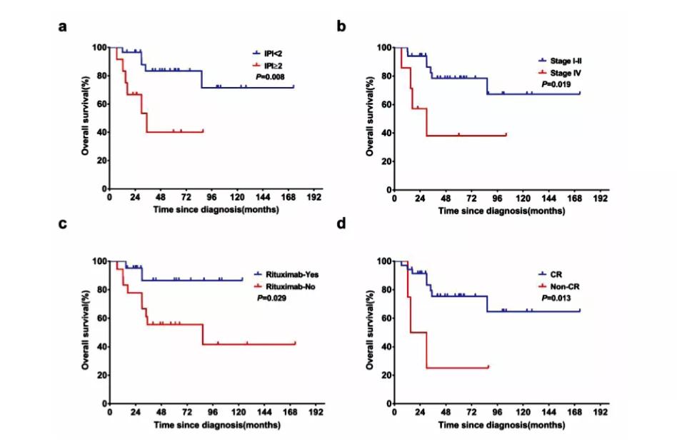 研究结果:41例PB-DLBCL患者中40例为女性,1例男性,中位年龄45岁,均以乳腺无痛性肿块为首发症状,3例伴有B症状。临床分期ⅠE期 21例(51.2%),ⅡE期 13例(31.7%),ⅣE期7例(17.1%)。17例患者进行进一步分型, 5例为生发中心来源(germinal center B cell like, GCB亚型),12例为非生发中心来源(non-GCB亚型)。治疗方法包括单纯手术(2例)、单纯化疗(4例)、手术联合化疗(18例)、手术联合化放疗(11例)、化疗序贯放疗(6例)。化疗联合利妥昔单抗(21例)、化疗联合大剂量甲氨蝶呤(high dose methotrexate, HD-MTX)和/或鞘注(7例)。中位随访49.5个月,全组死亡11例(26.8%),中位总生存期(overall survival, OS)为40.3个月,中位无疾病进展时间(progression free survival,PFS)为25.0个月。5 年OS和PFS率分别为71.5%和57.9%。单因素分析结果显示IPI评分、Ann Arbor分期、利妥昔单抗及化疗疗效与OS有关(P<0.05)(图1),而IPI评分、利妥昔单抗及化疗疗效与PFS有关(P<0.05)(图2)。多因素分析结果显示IPI评分(P=0.013)及利妥昔单抗(P=0.012)是OS的独立预后因子;利妥昔单抗(P=0.008)及化疗疗效(P=0.014)是PFS的独立预后因子。