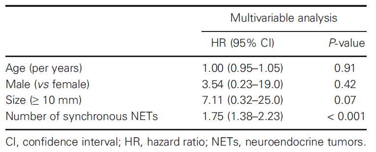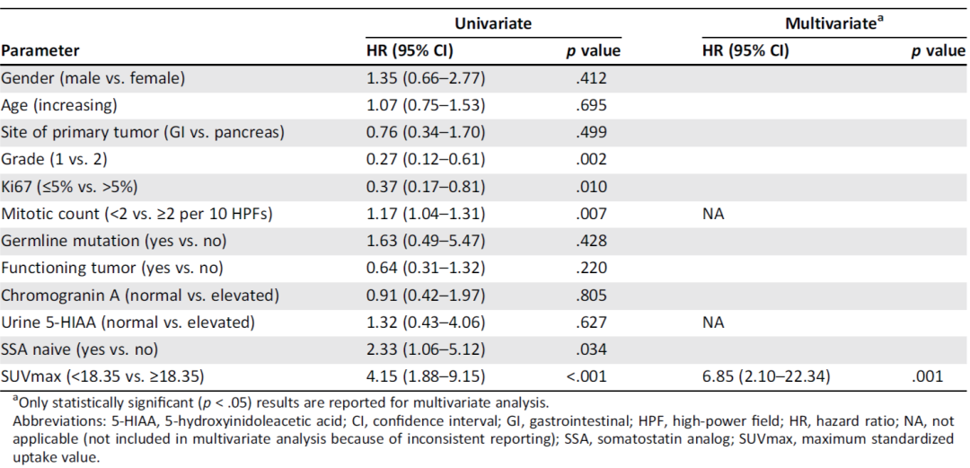 表1. 单用SSA治疗胃肠胰神经内分泌肿瘤患者疾病进展的危险/保护因素