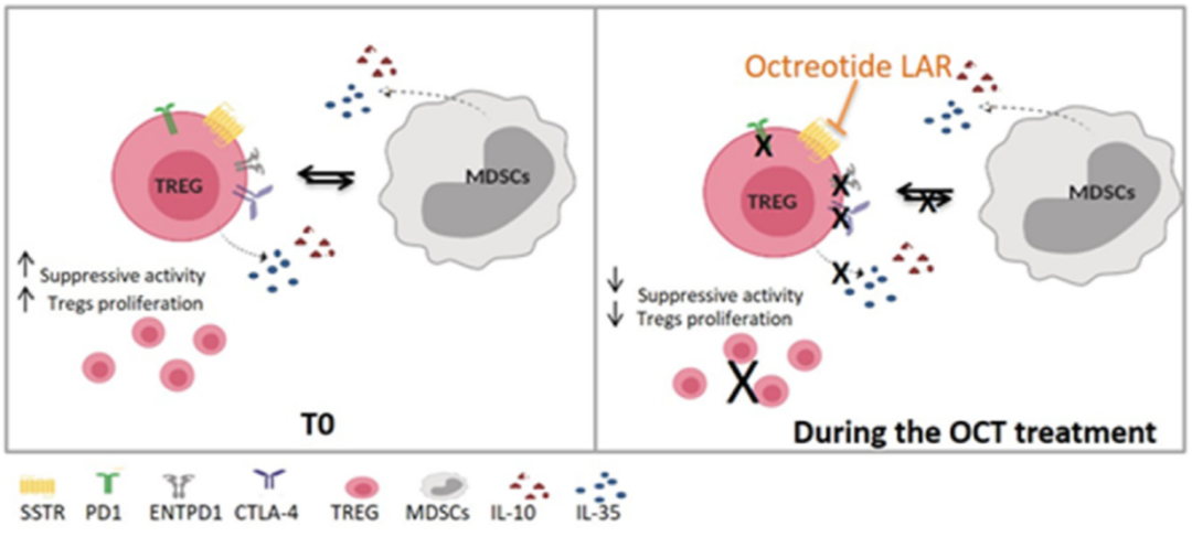 该研究发现,与健康供体相比,NENs患者的循环Tregs升高,OCT LAR可显著降低总Tregs水平和三个功能性Tregs群:nTregs、eTregs和非Tregs的水平。此外,OCT LAR治疗可抑制其余Tregs的功能,显著降低PD1、CTLA4和ENTPD1的表达。研究报道了OCT LAR治疗患者循环MDSC细胞的变化趋势。该研究的结果表明,OCT LAR对Tregs的影响可以使患者的免疫系统平衡朝着持久的抗肿瘤免疫监视方向发展,从而长期控制NENs疾病。