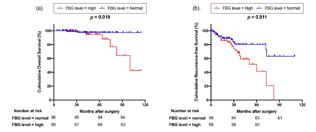 图1. a空腹血糖水平高和低(N=164)患者总体生存率的Kaplan-Meier曲线。b空腹血糖水平高和低的患者(N=164)无复发生存率的Kaplan-Meier曲线。P值源自Log-rank检验。FBG,空腹血糖。