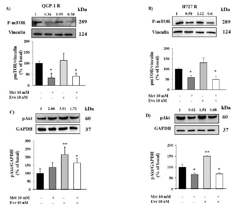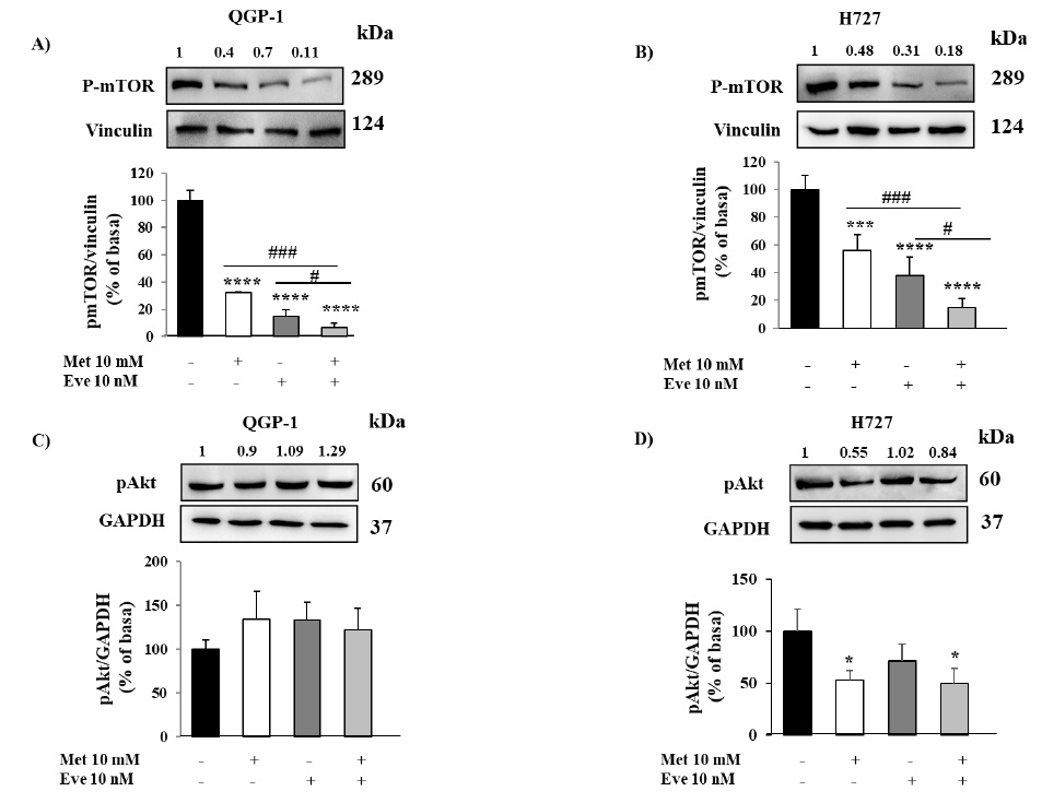 图3. 二甲双胍(Met)和依维莫司(Eve)对QGP-1和H727细胞mTOR和Akt磷酸化的影响。(A,B)磷酸化mTOR的代表性免疫印迹显示,在两种细胞系中,二甲双胍和依维莫司联合应用对mTOR的抑制作用比各药单一疗法更有效。(C)磷酸化Akt的免疫印迹显示二甲双胍不影响QGP-1细胞系中Akt的磷酸化。图中显示了标准化为管家基因GAPDH的定量磷酸化Akt (3个独立实验的平均值±SD)。(D)磷酸化Akt的免疫印迹显示二甲双胍显著降低H727细胞株Akt磷酸化。