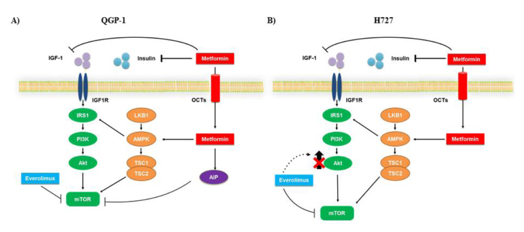 图6. 二甲双胍和依维莫司对QGP-1和H727细胞作用机制的示意图。二甲双胍通过50-AMP活化蛋白激酶(AMPK)依赖或独立的途径发挥作用,导致mTORC1复合物抑制。依维莫司抑制mTOR磷酸化,但其长期使用受到耐药性发展的限制,可能是由于Akt信号的激活。二甲双胍和依维莫司联合应用可诱导更有效的mTOR阻断,并可能抵消依维莫司引发的耐药机制。(A)在QGP-1细胞中,二甲双胍不抑制Akt磷酸化,可能通过AIP途径降低mTOR磷酸化。(B)在H727细胞中,二甲双胍降低Akt磷酸化以抑制mTOR磷酸化。