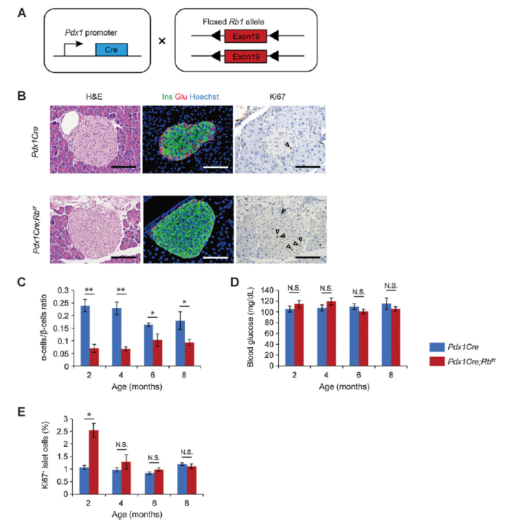 图1. Rb缺陷对胰岛细胞的影响。A,产生Pdx1-Cre;Rbf/f小鼠的实验策略。箭头,转录方向;楔形箭头,loxP位点。B,2个月龄的Pdx1-Cre和Pdx1-Cre;Rbf/f小鼠胰岛细胞的苏木精和伊红(H&E)、IHC和免疫荧光染色。箭头,Ki67阳性细胞。比例尺,100mm。C,2、4、6和8个月龄Pdx1-Cre和Pdx1-Cre;Rbf/f小鼠(N=3–5)胰岛细胞的α细胞/β细胞比率。D, 2、4、6和8个月龄Pdx1-Cre和Pdx1-Cre;Rbf/f小鼠(N=10-14)禁食4小时后的血糖水平。E, 2、4、6和8个月龄Pdx1-Cre和Pdx1-Cre;Rbf/f小鼠(N=3–5)中的Ki67阳性胰岛细胞。*P<0.05;**P<0.01;N.S.,无显著性。