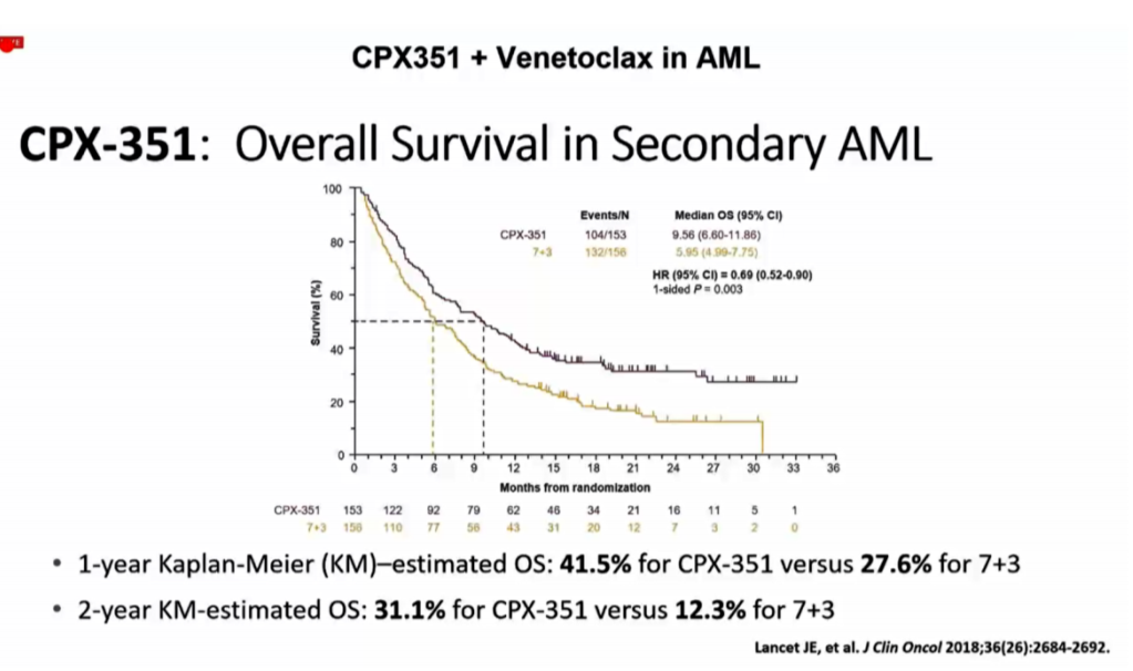 研究背景:CPX-351已获批用于治疗既往骨髓增生异常综合征(MDS)引起的治疗相关AML或继发性AML(s-AML)患者。与7 + 3相比,CPX-351在s-AML患者中表现出更高的缓解率(ORR)、更好的耐受性和更好的生存期(OS)。