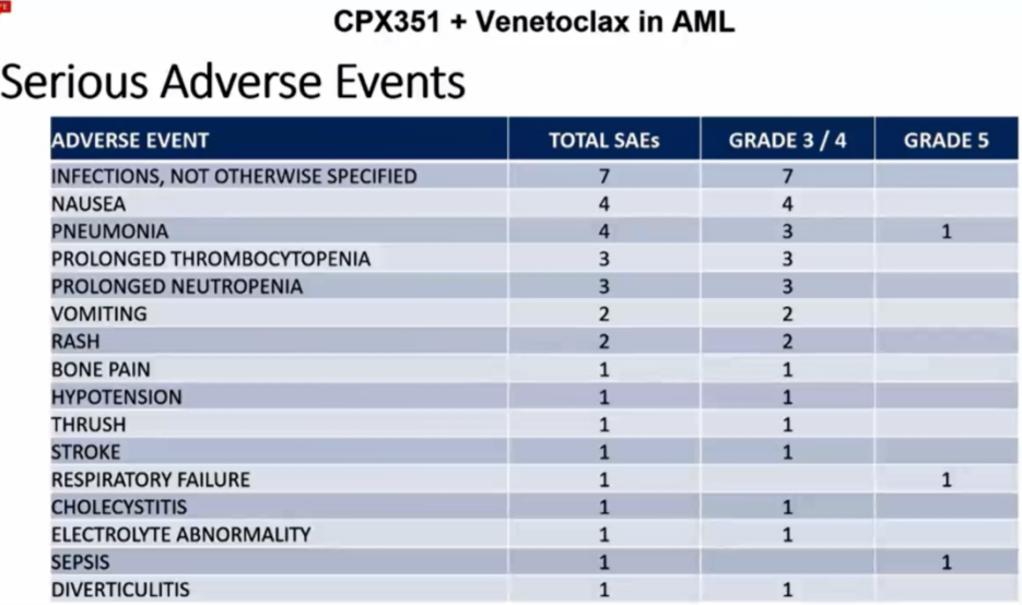 研究目的:本研究旨在探索维奈托克联合CPX-351对AML患者的安全性和疗效。