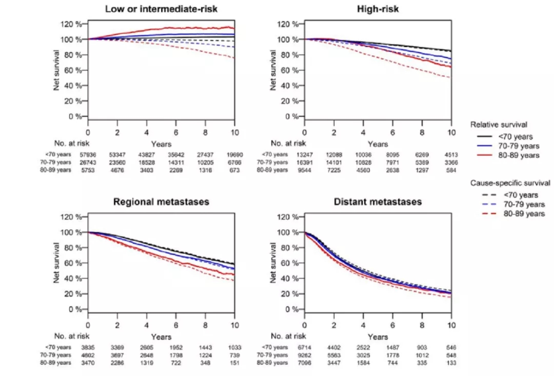 结果:在80~90岁低危前列腺癌患者中,10年相对生存率显著高于病因特异性生存率(125% [95%CI:113%~138%] vs. 85% [95%CI:82%~88%]);中危PCa患者也可见类似的差异。相反,在70岁以下及所有区域或远处转移的患者中,相对生存率和病因特异性生存率类似,差异不超过7%,详见图3。